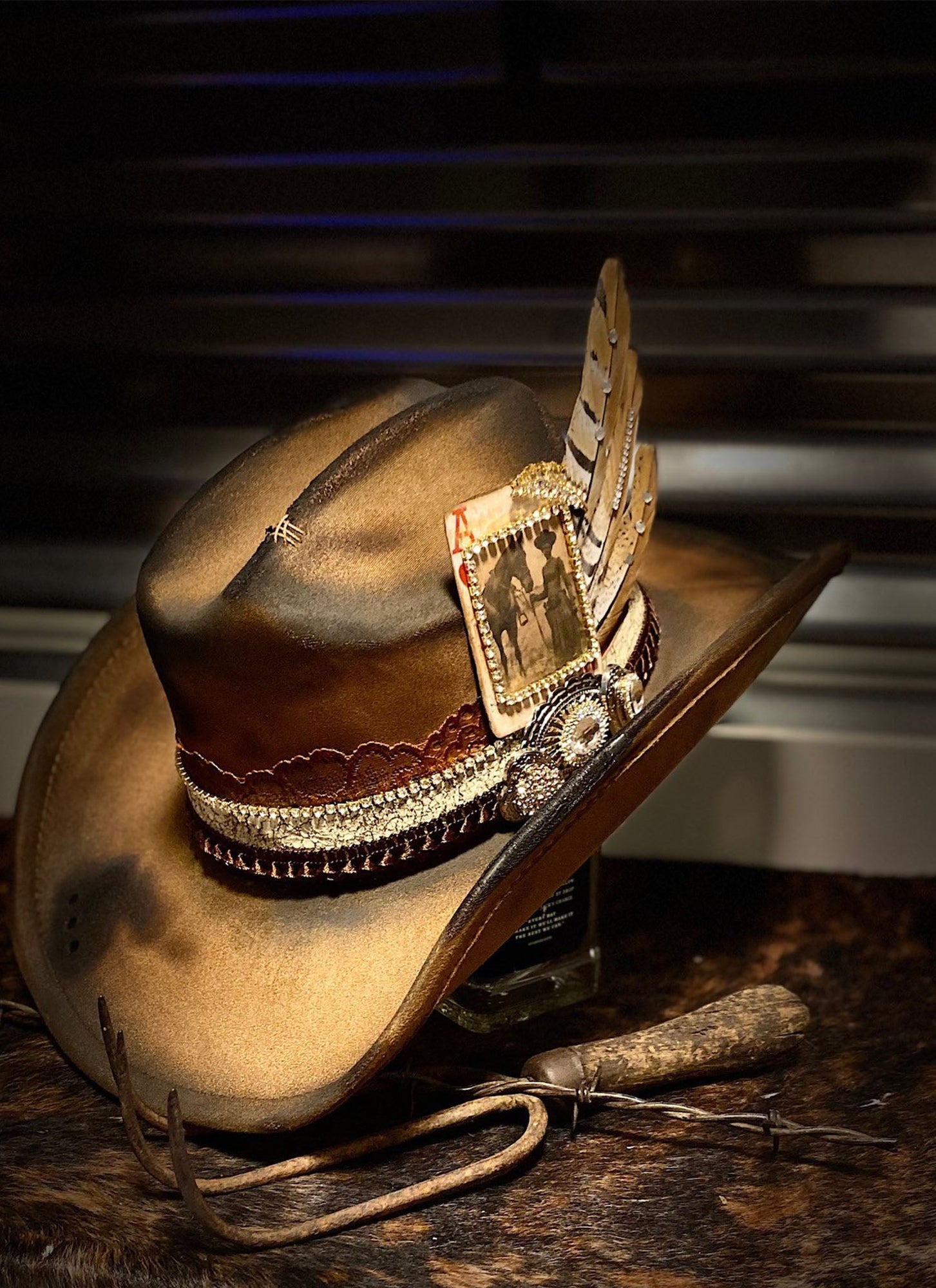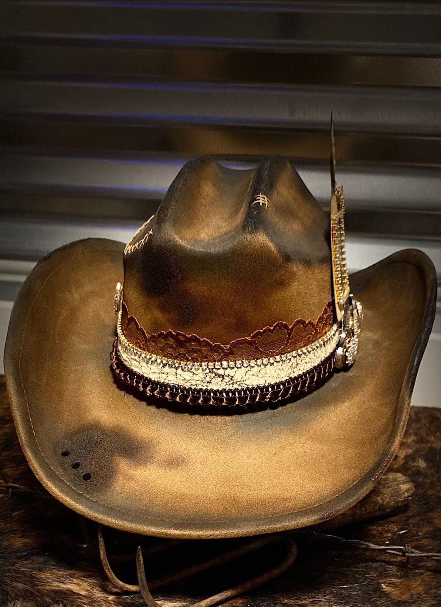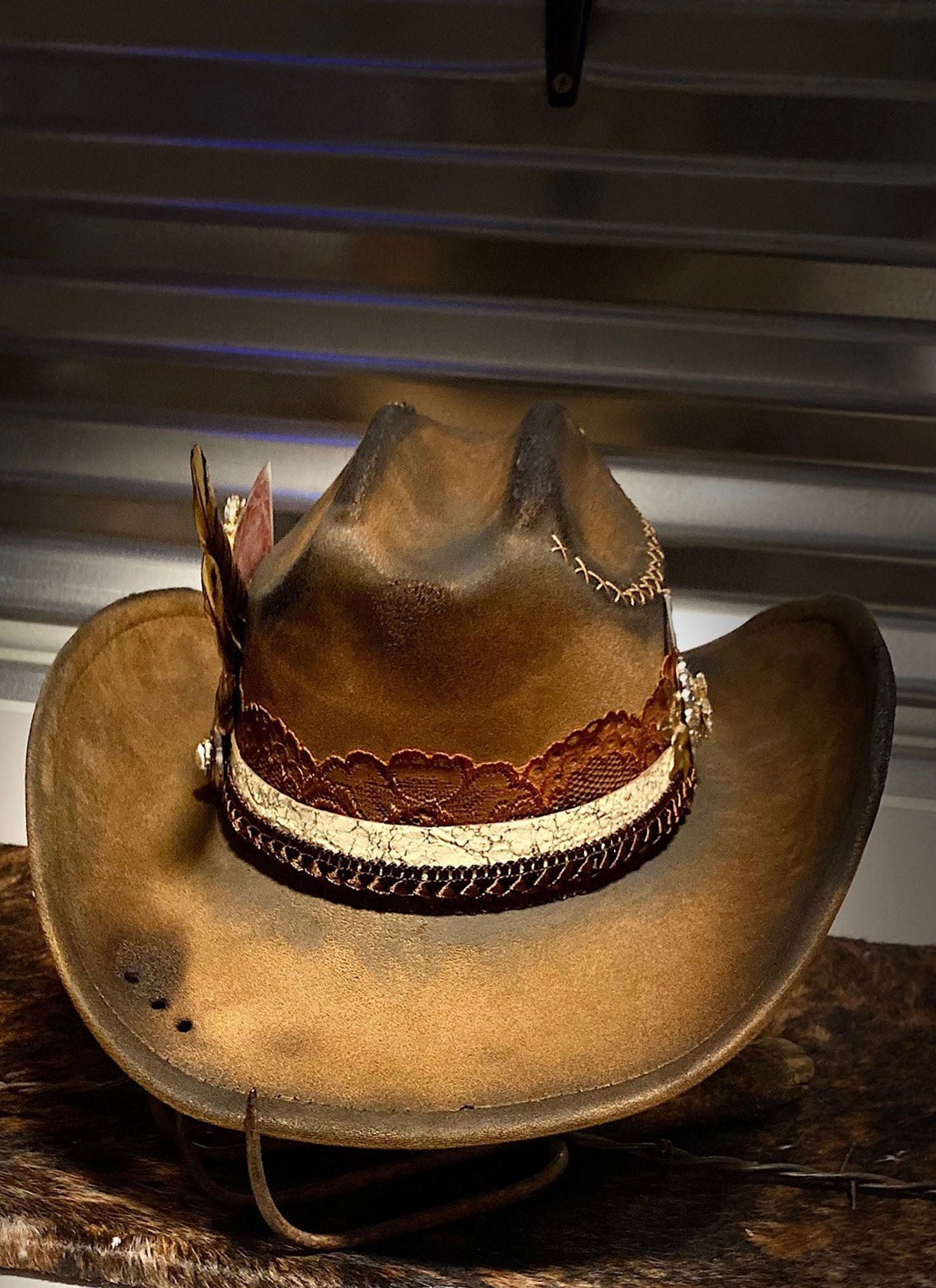 Hatband: Distressed Lace, Dark Brown Trim, Crackle Leather, Rhinestone Chain, Hand Stitching, Rhinestone Components, Swarovski Crystals accent the feathers.