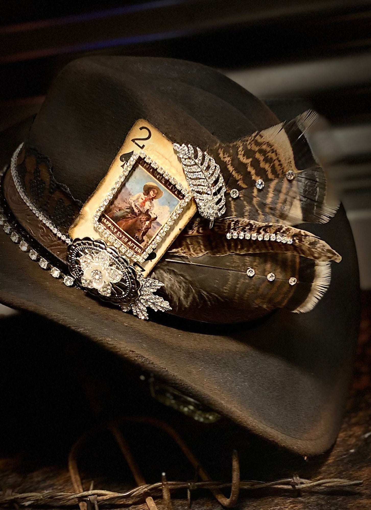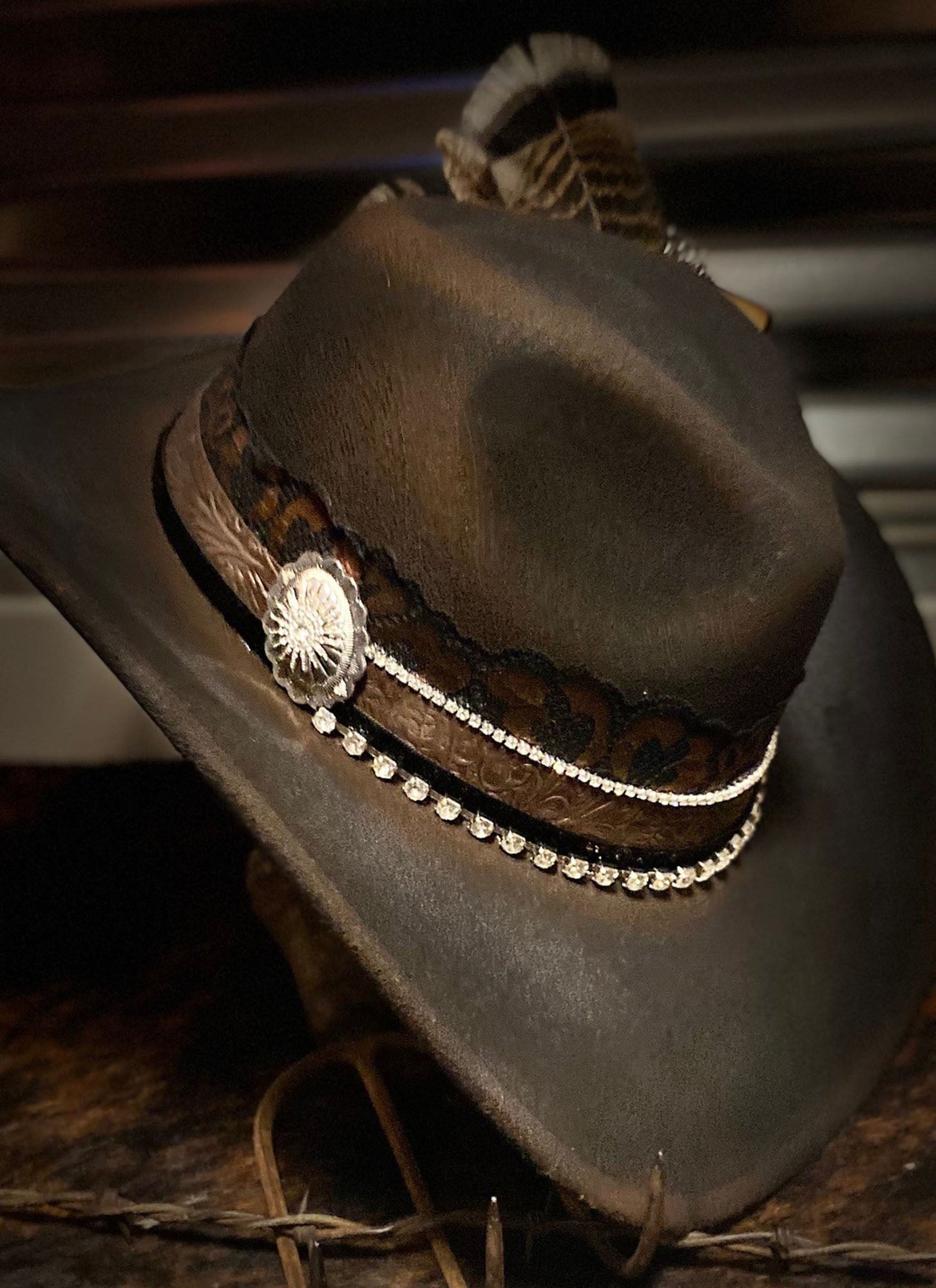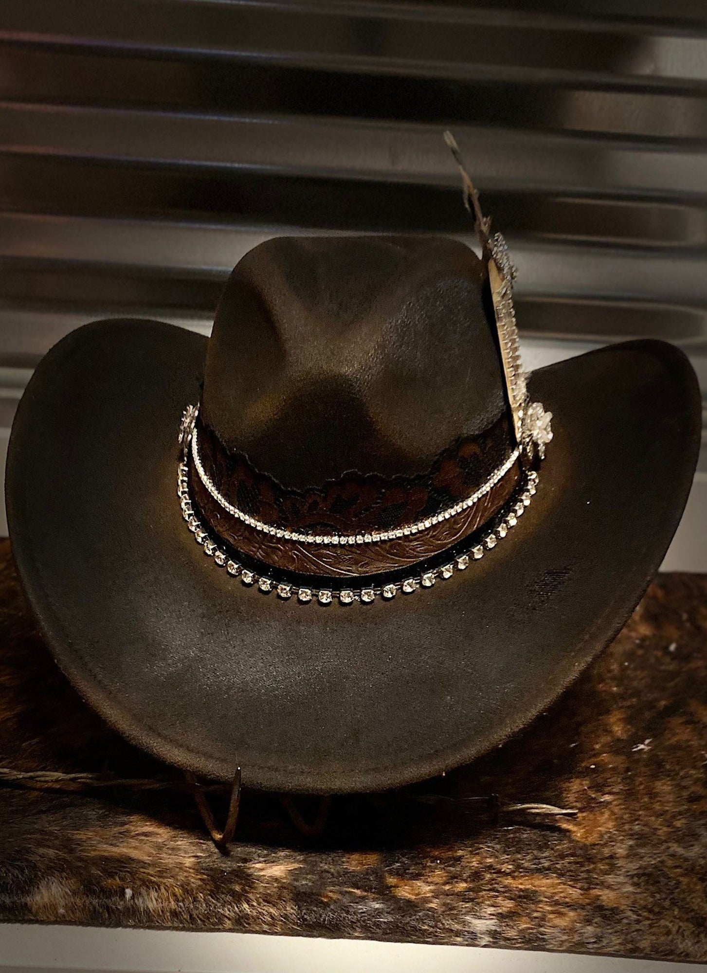 Hatband: Embossed Leather, Black & Brown Lace, Concho Components, Rhinestone Components, Metallic Trim, Pink Floral Rhinestone Chain, $warovski Crystals On Feathers