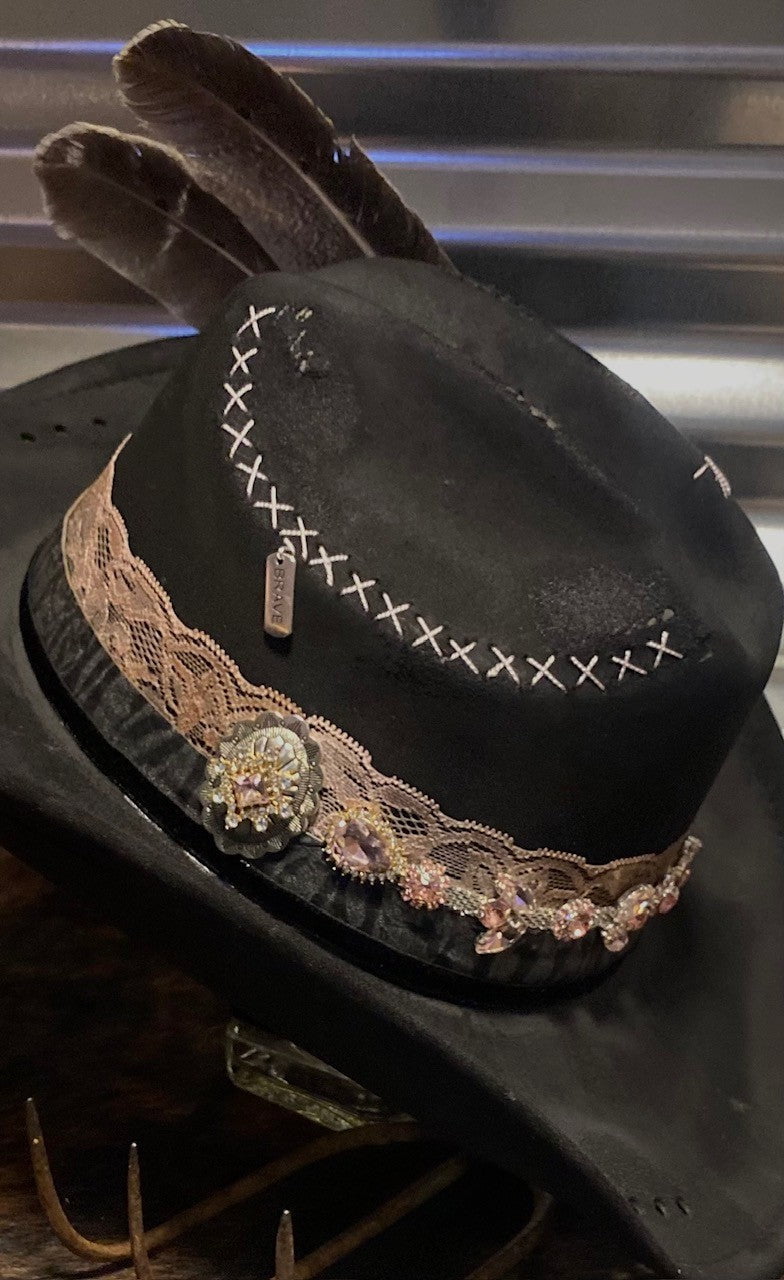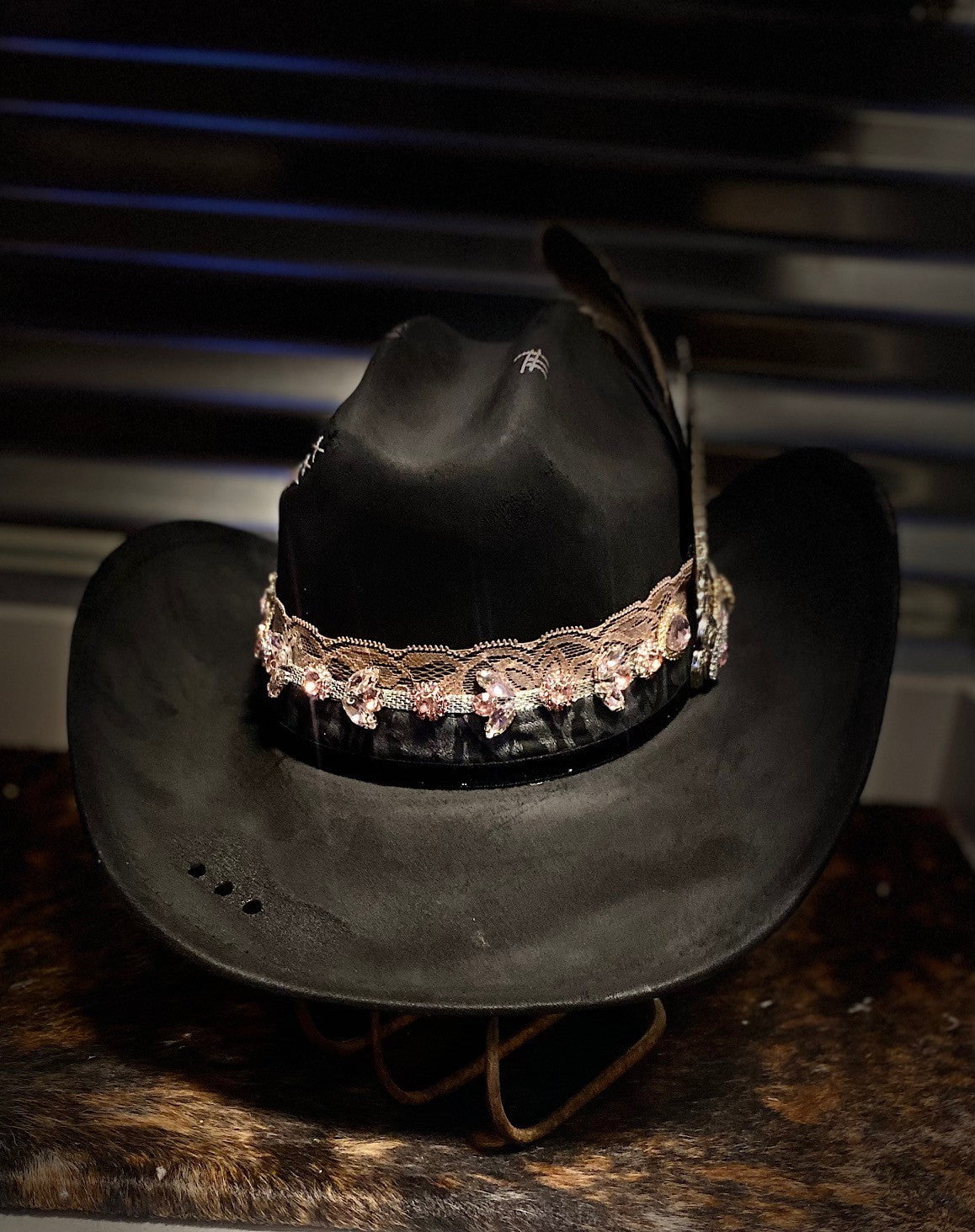 Hatband: Leather, Pink Lace, Concho Components, Rhinestone Components, Metallic Trim, Pink Floral Rhinestone Chain, $warovski Crystals On Feathers
