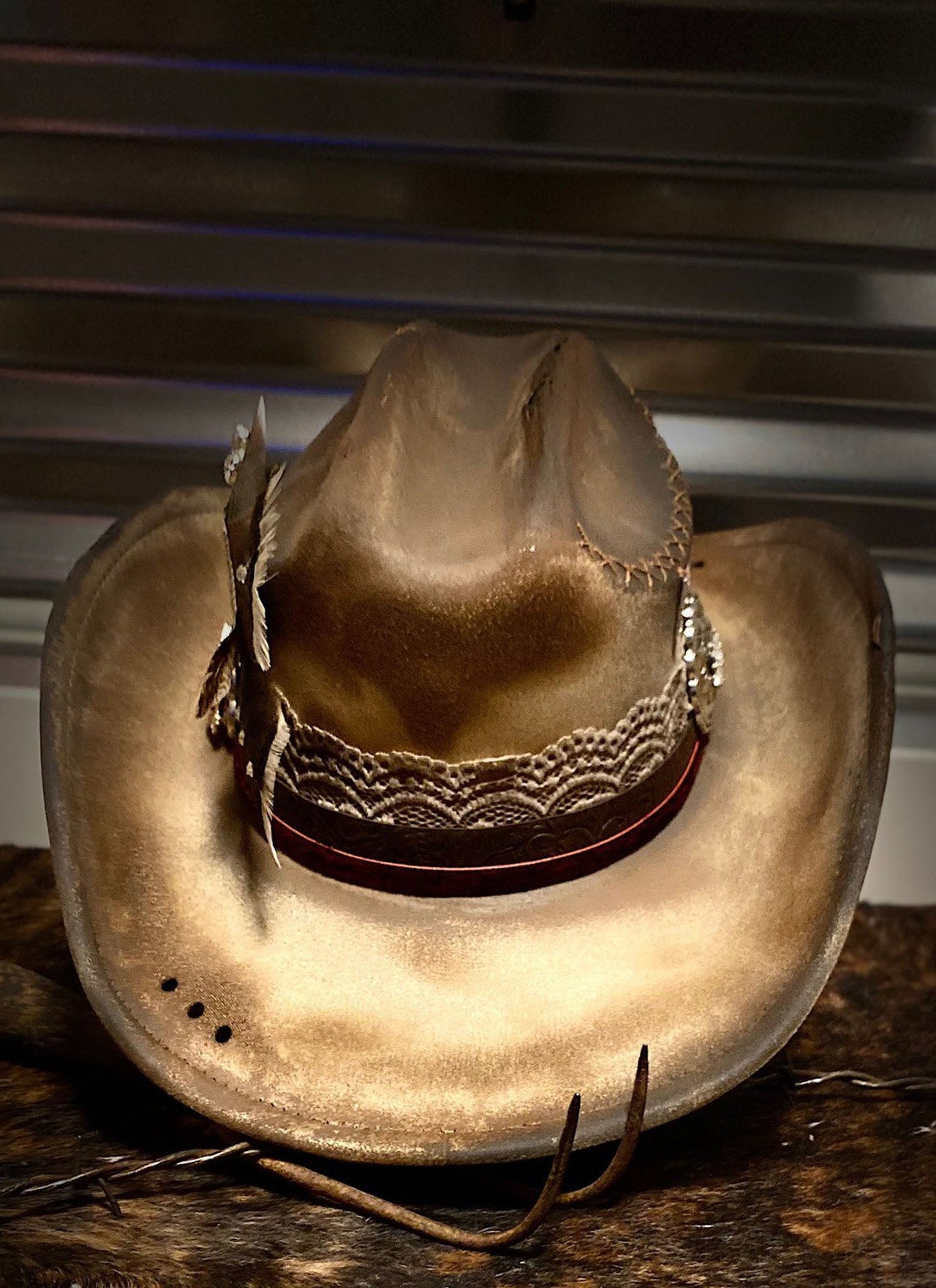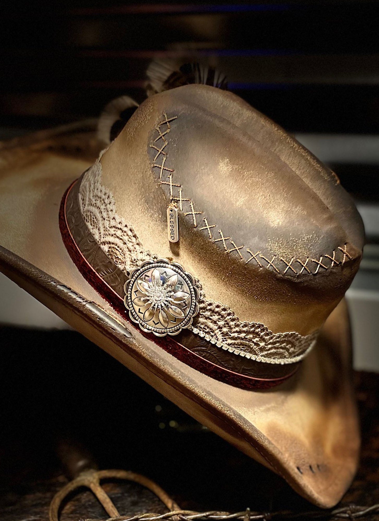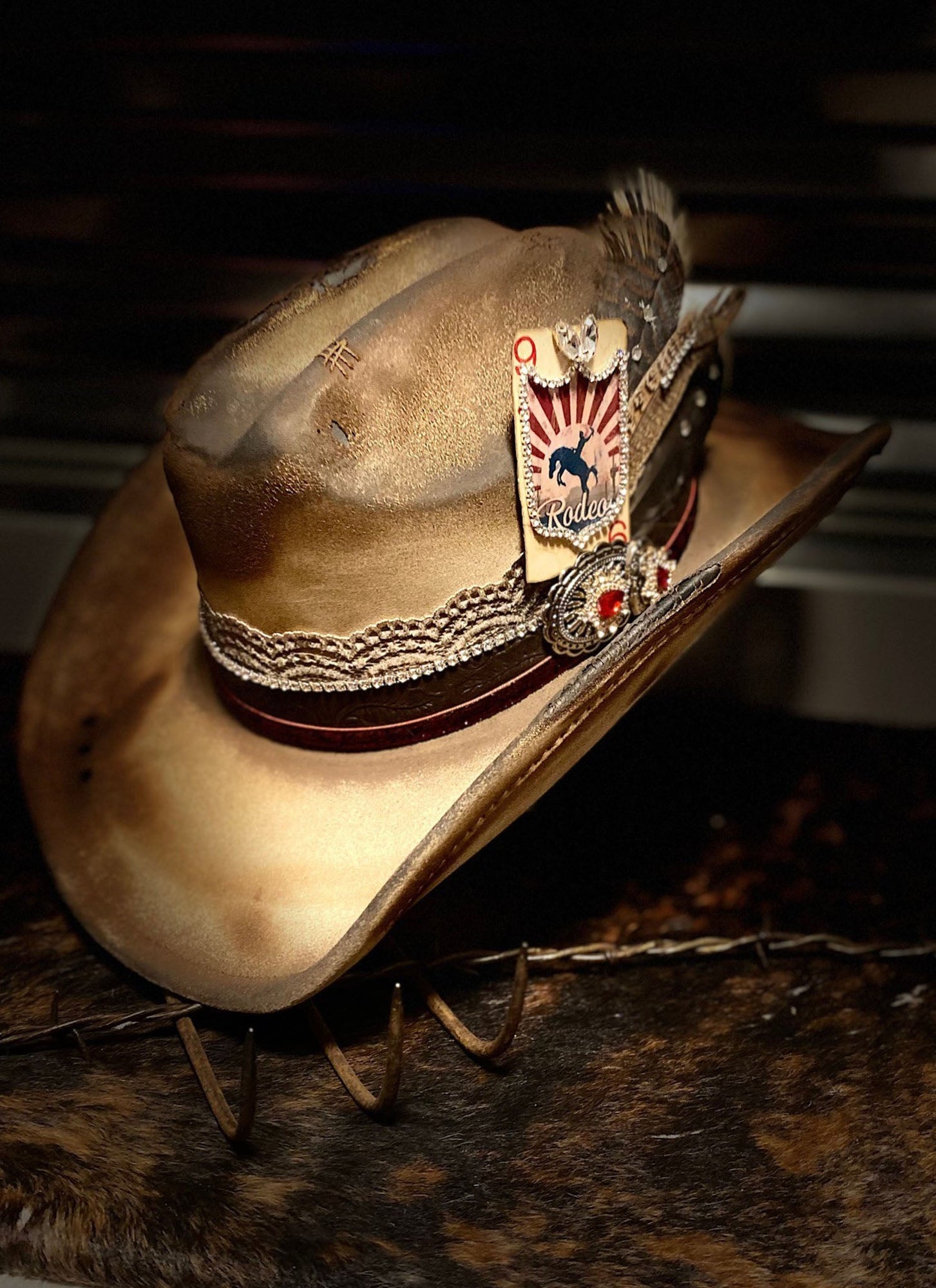 Hatband: Distressed Lace, Velvet Red Trim, Embossed Leather, Rhinestone Chain, Rhinestones components, Hand Stitching, Conchos, $warovski Crystals accent the feathers