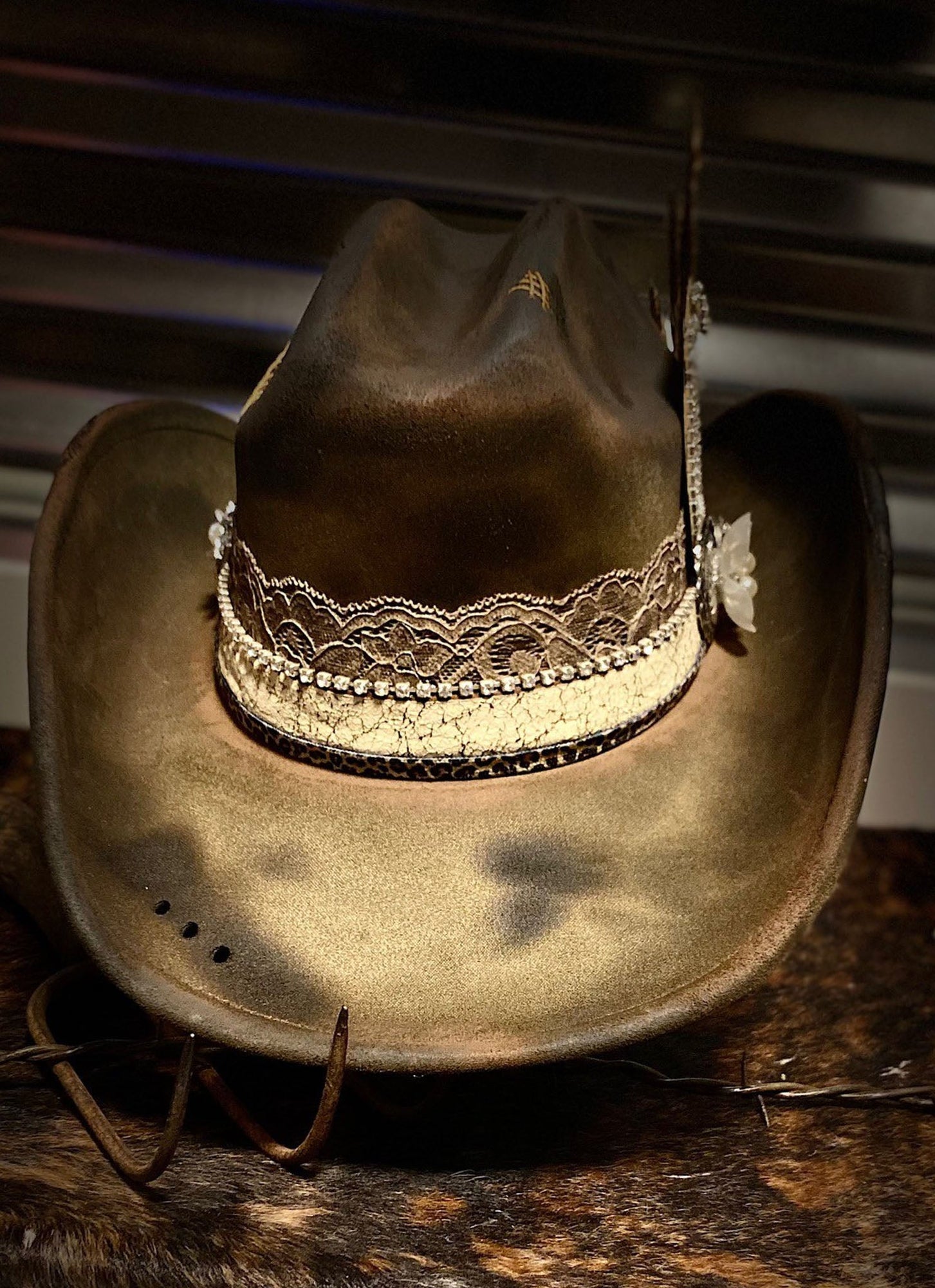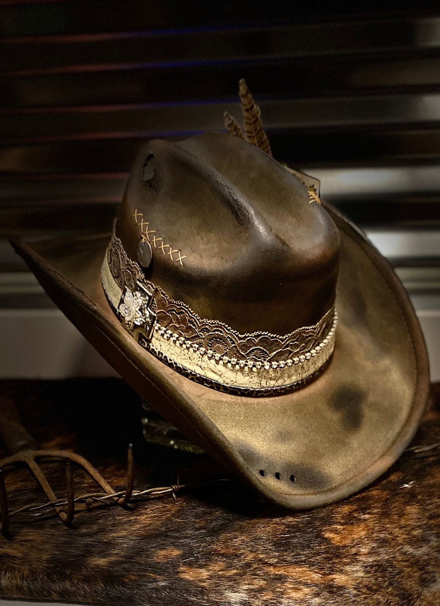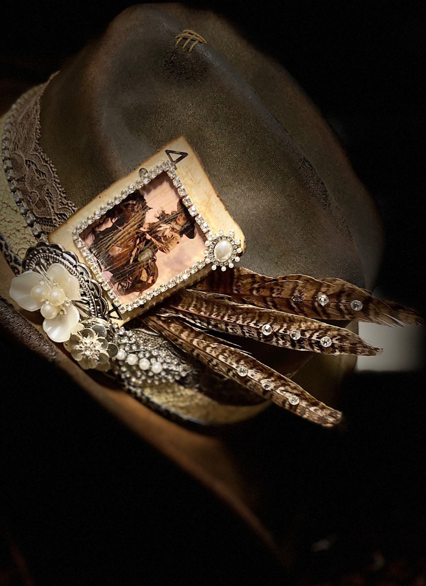 Hatband: Distressed Lace, Crackel Leather , Leopard Trim, Rhinestone Chain, Hand Stitching, Conchos, $warovski Crystals accent the feathers