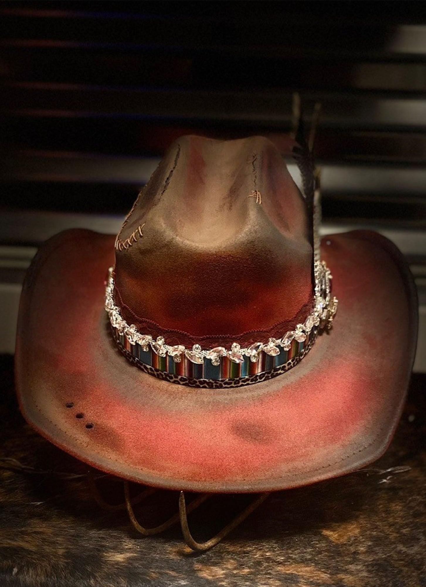 Hatband: Embossed Leather, Sarape Print, Distressed Lace, Floral Rhinestone Chain, Concho Components, Swarovski Crystals Accent the Feathers.