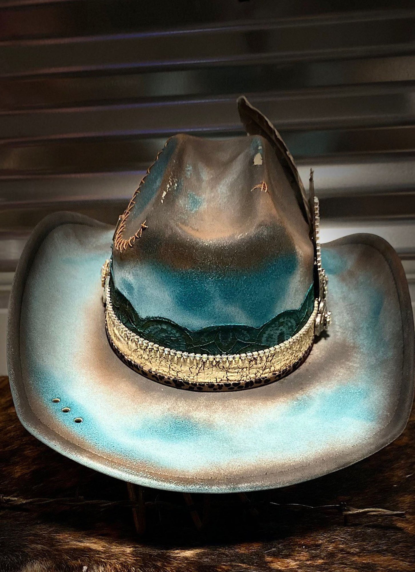 Hatband: Distressed Lace, Crackle Leather, AB Rhinestone Chain, Leopard Trim, Hand Stitching, Rhinestone Components with Conchos, Feathers Accented with AB Rhinestones