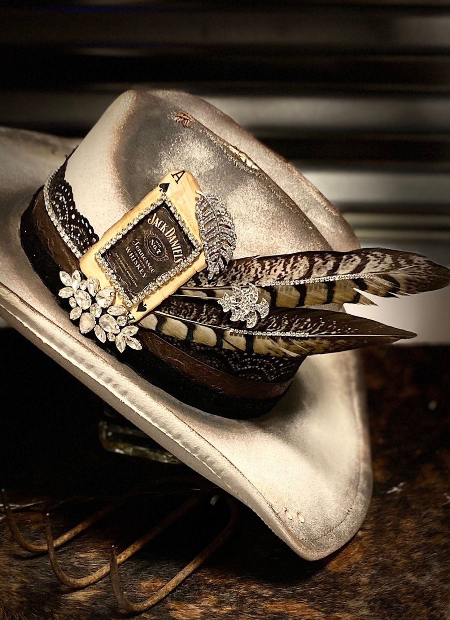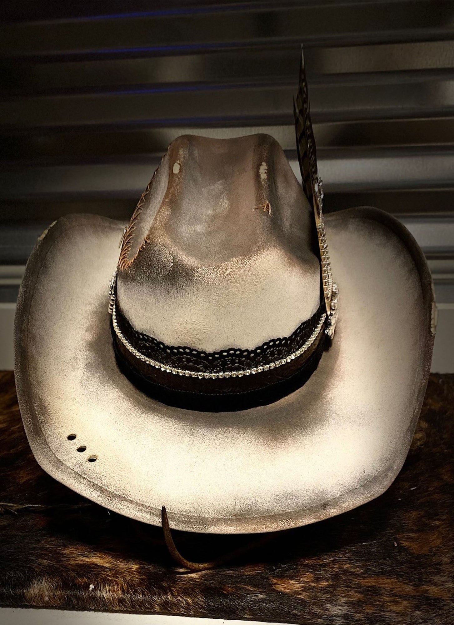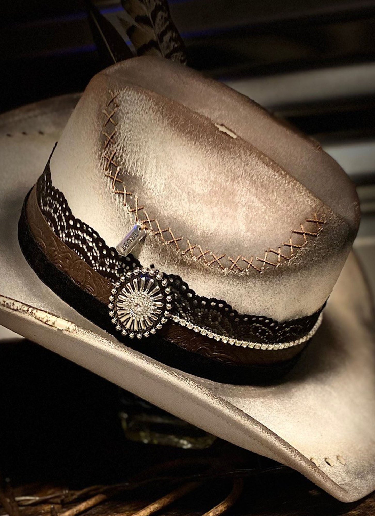 Hatband: Distressed Brown Lace, Rhinestone Chain, Rhinestone Components, Embossed Leather, Hand Stitching, Metallic Trim, $warovski Crystals On Feathers!