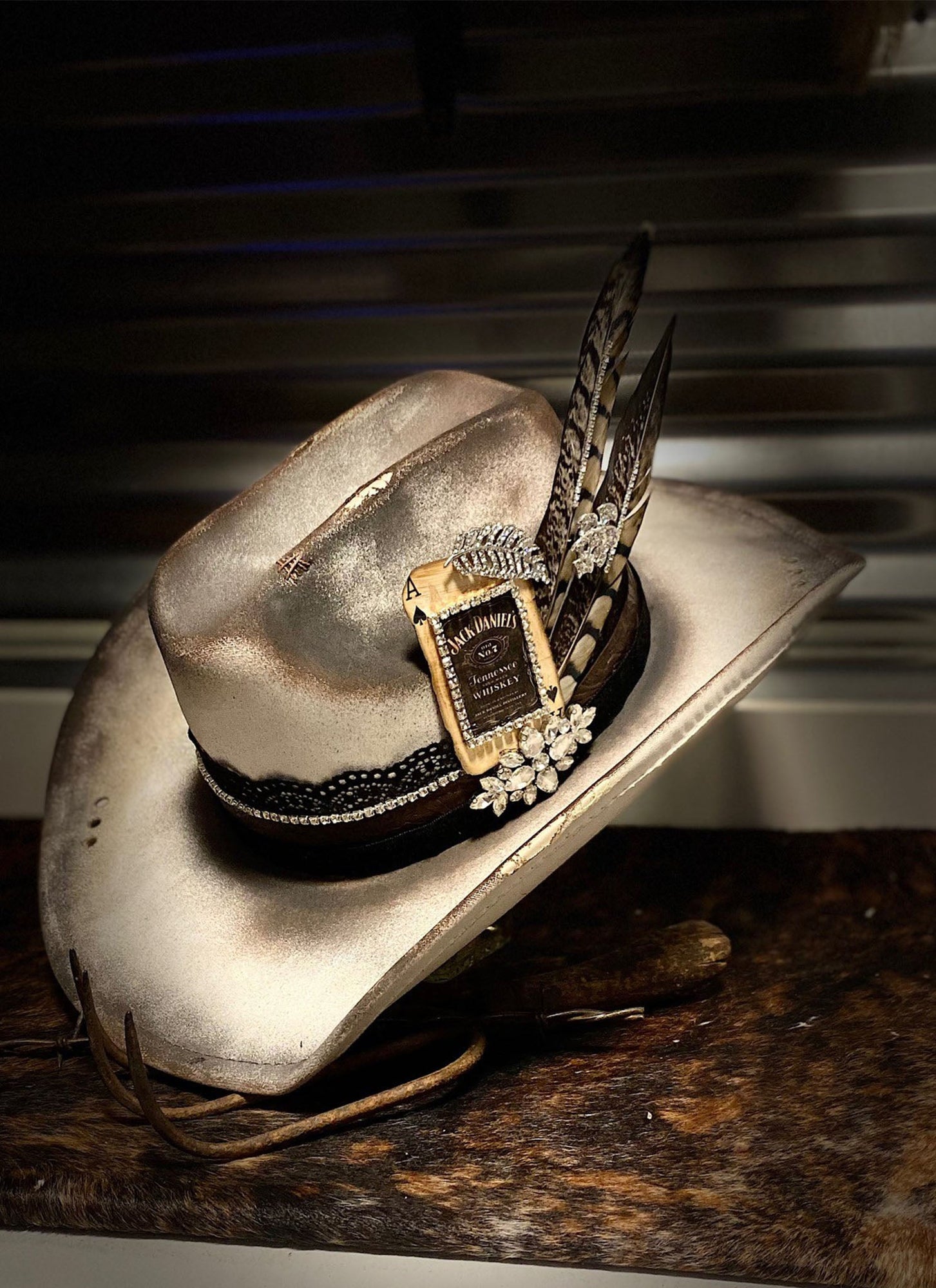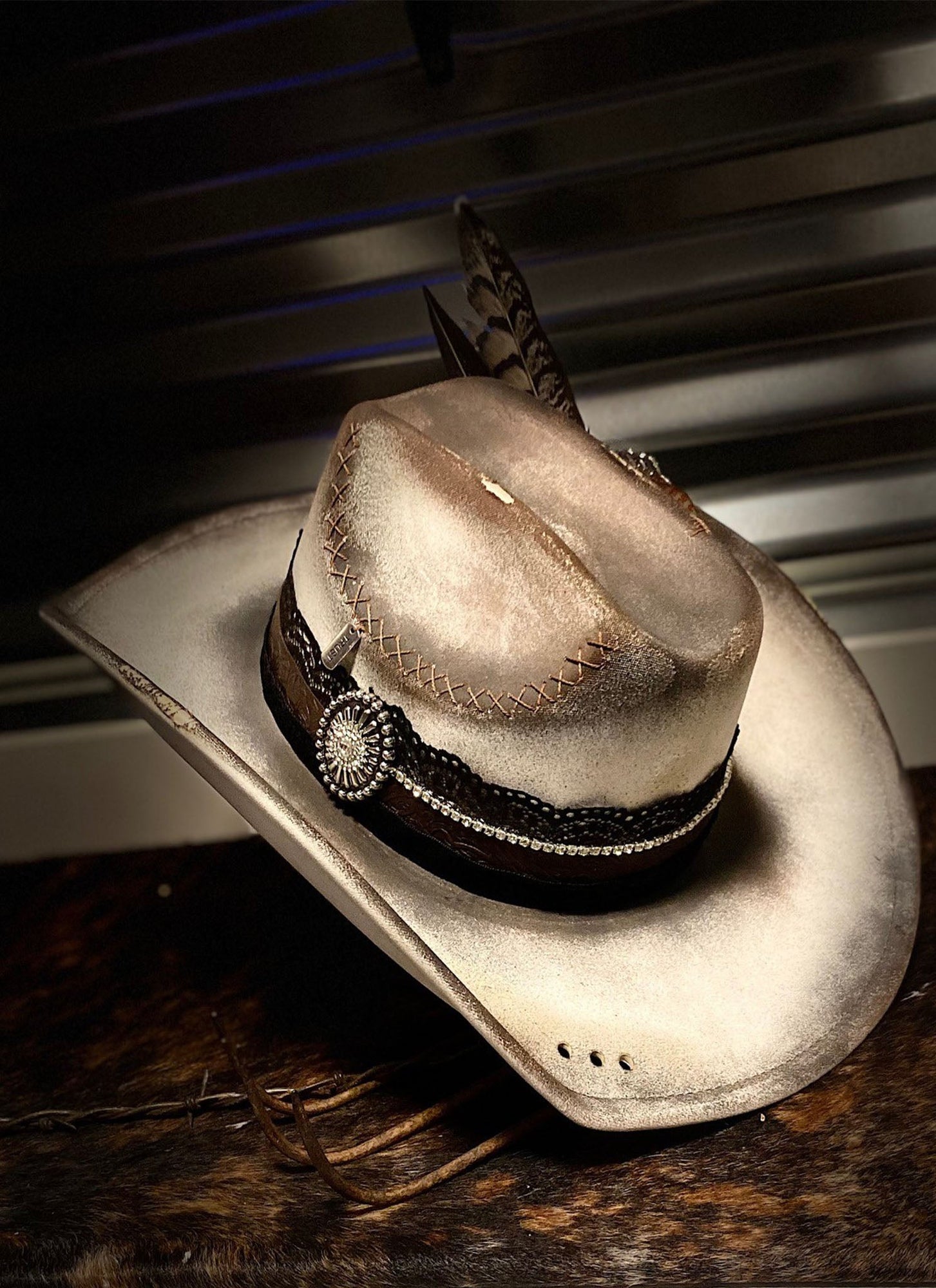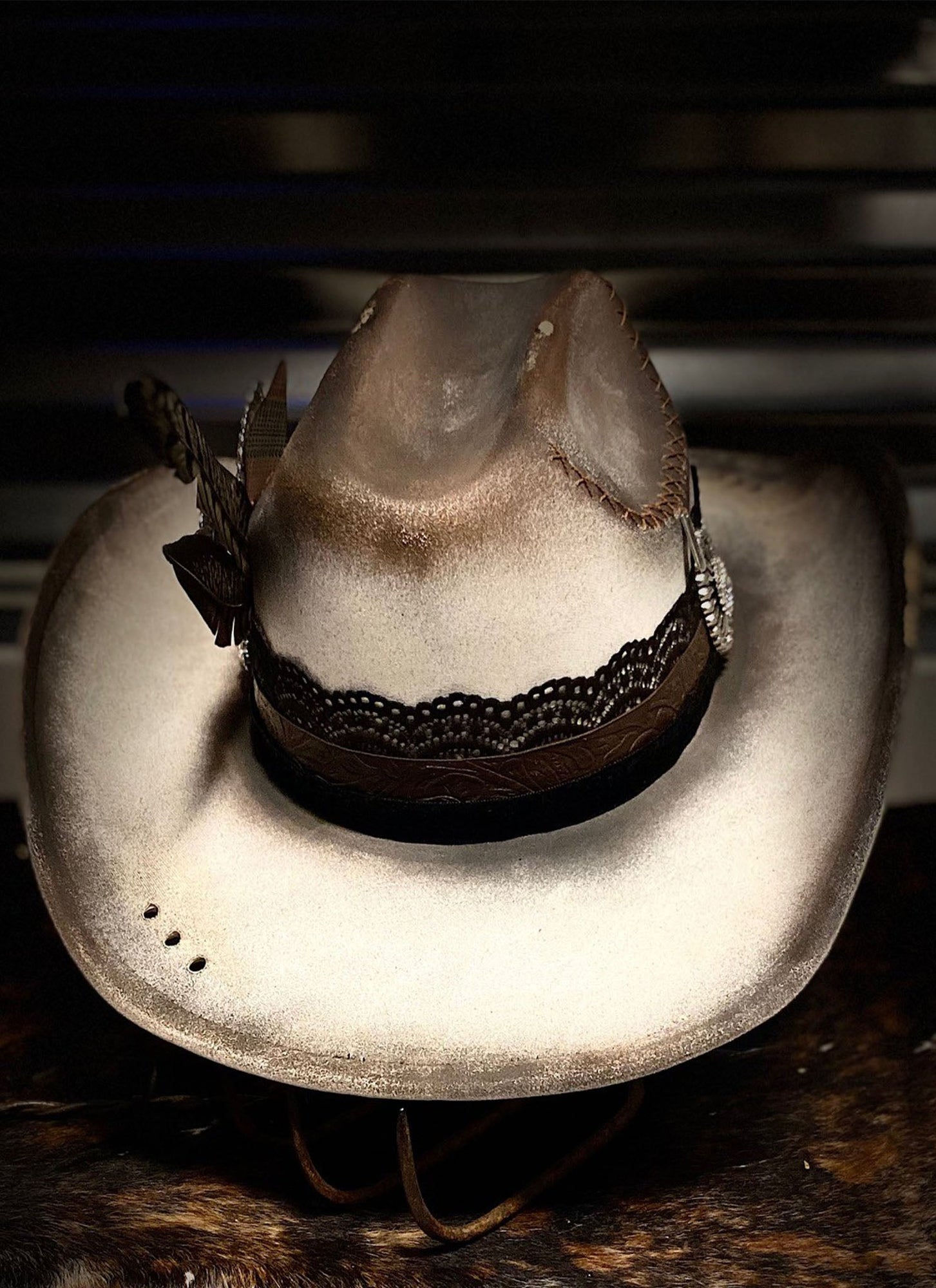 Hatband: Distressed Brown Lace, Rhinestone Chain, Rhinestone Components, Embossed Leather, Hand Stitching, Metallic Trim, $warovski Crystals On Feathers!