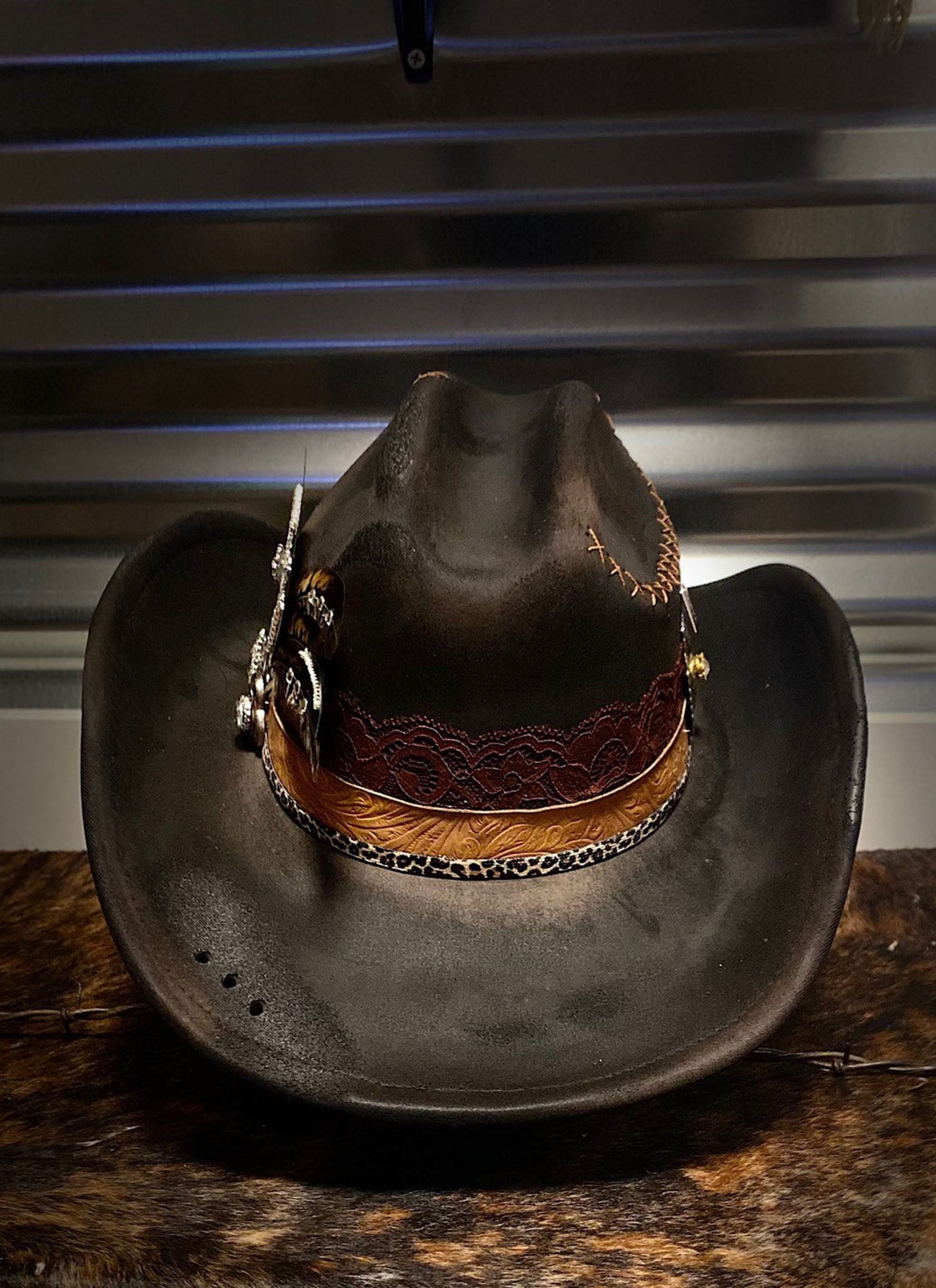 Hatband: Distressed Brown Lace, Rhinestone Chain, Rhinestone Components, Embossed Leather, Hand Stitching, Leopard Trim, $warovski Crystals On Feathers!