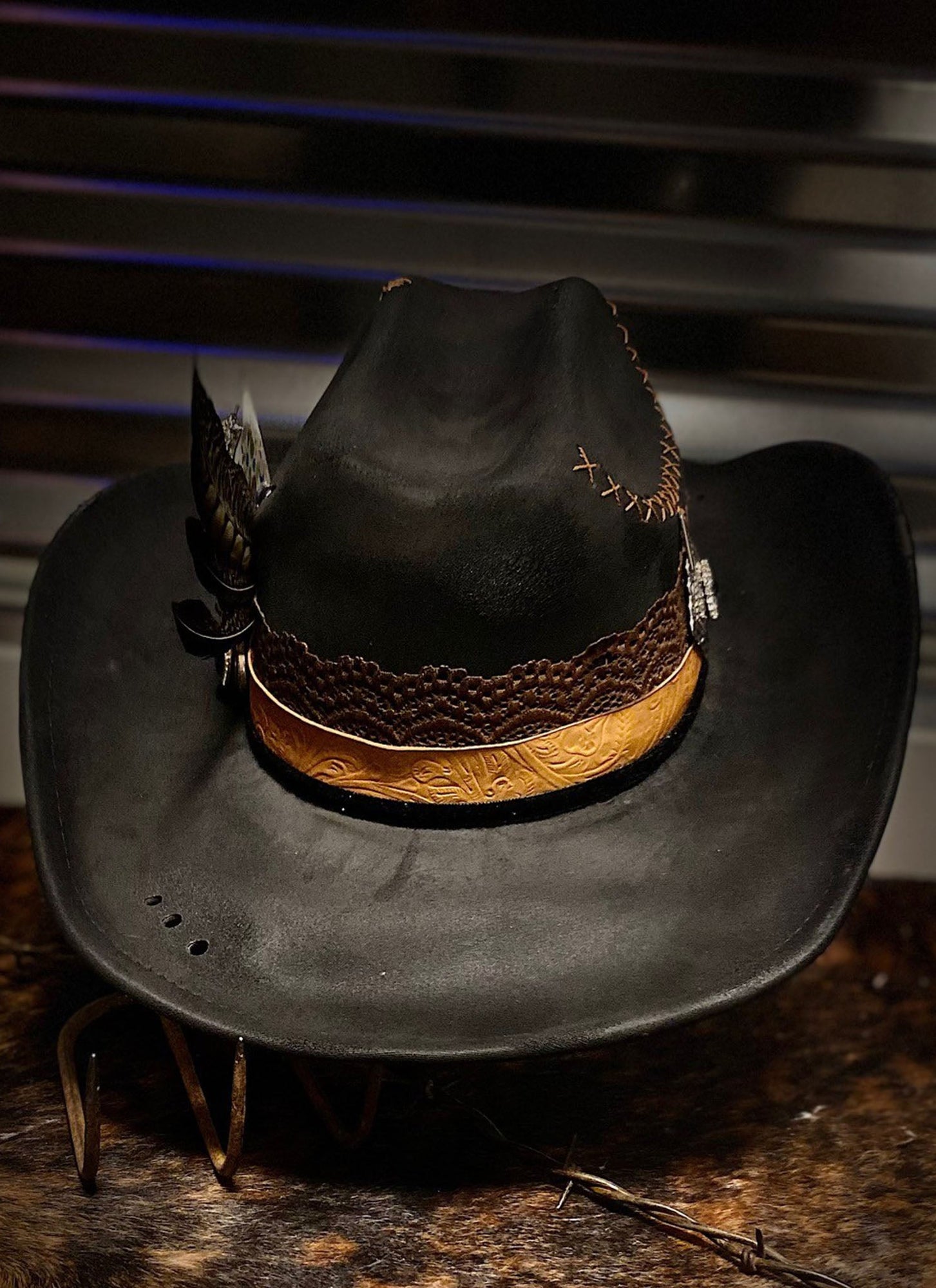 Hatband: Distressed Lace, Rhinestone Chain, Rhinestone Components, Embossed Leather, Hand Stitching, Black Velveteen Trim, Swarovski Crystals On Feathers!