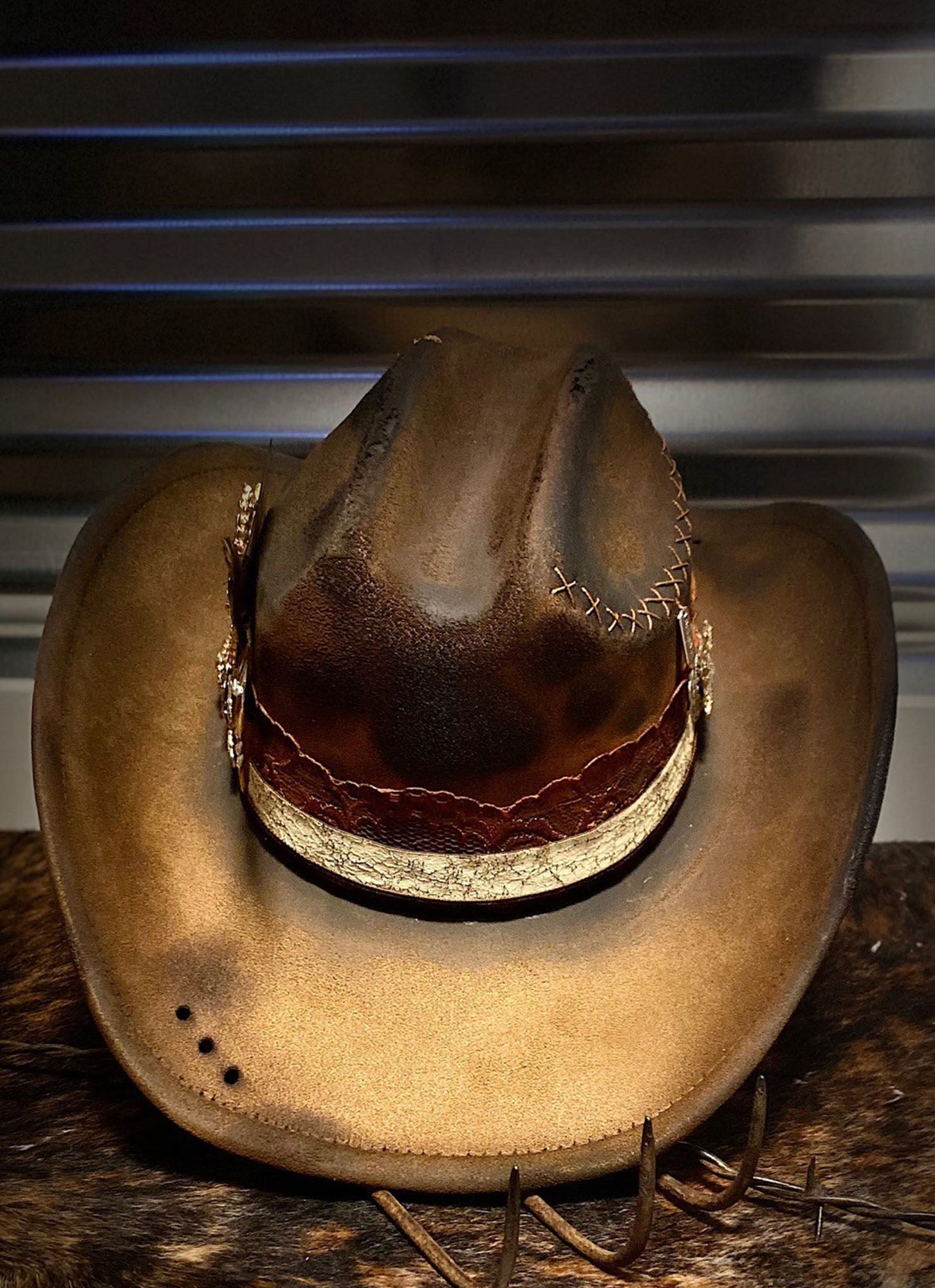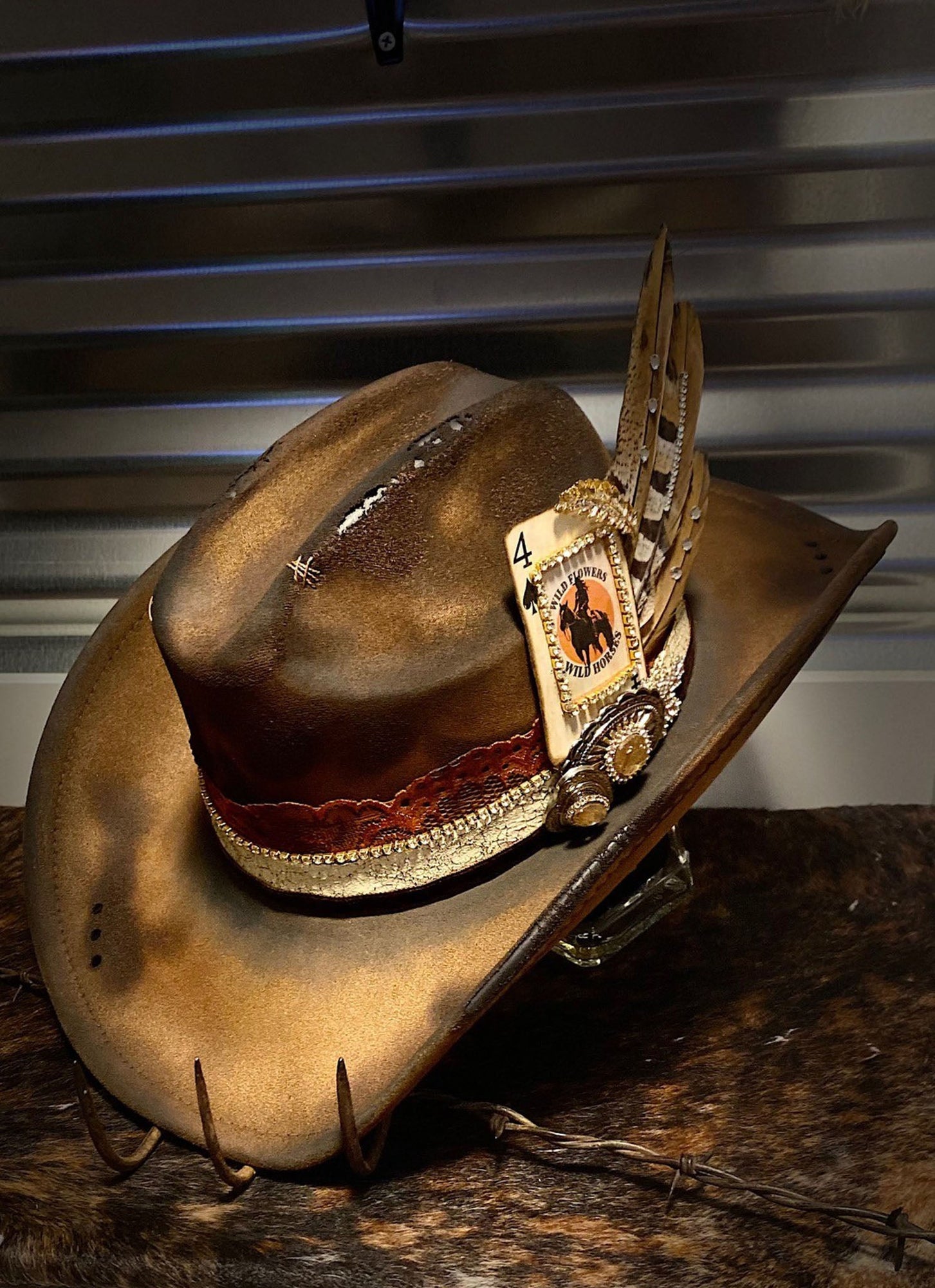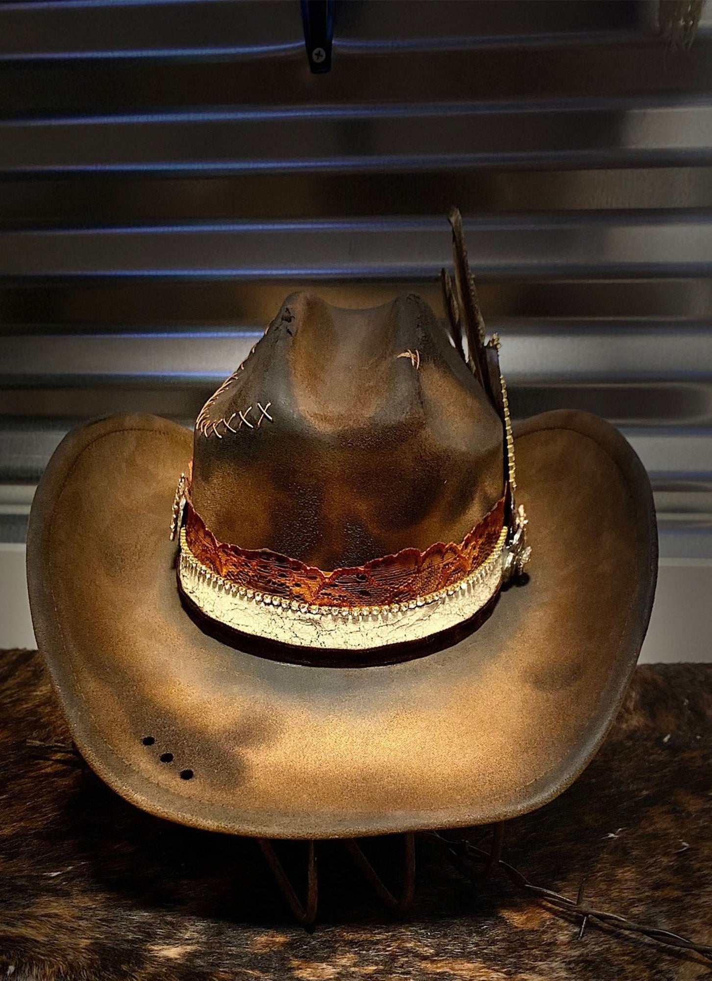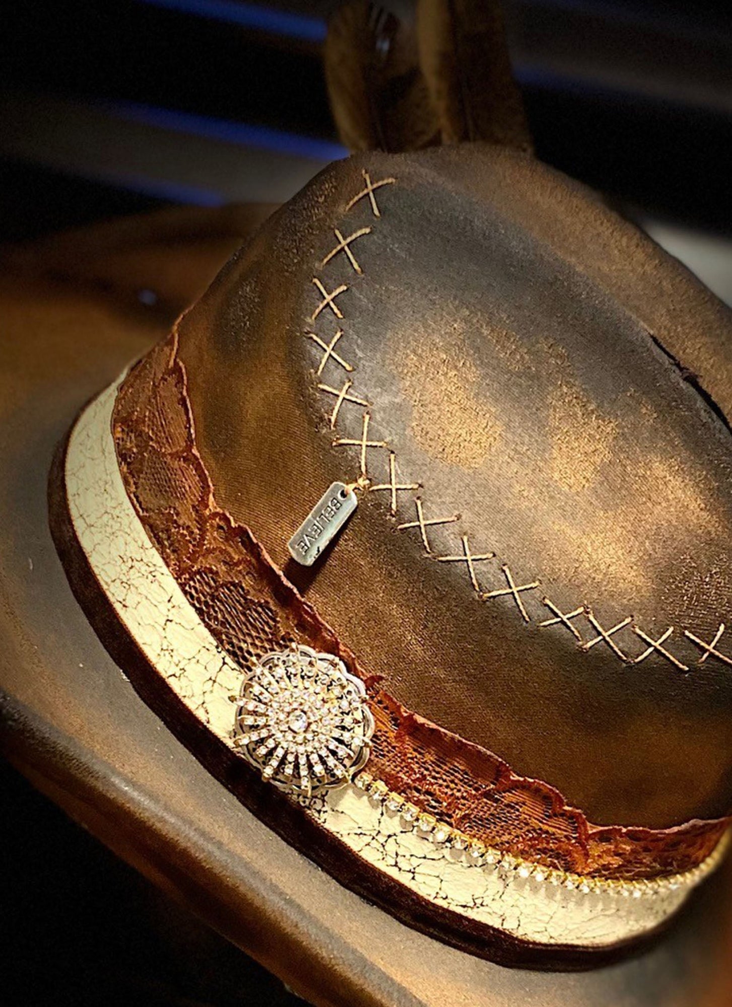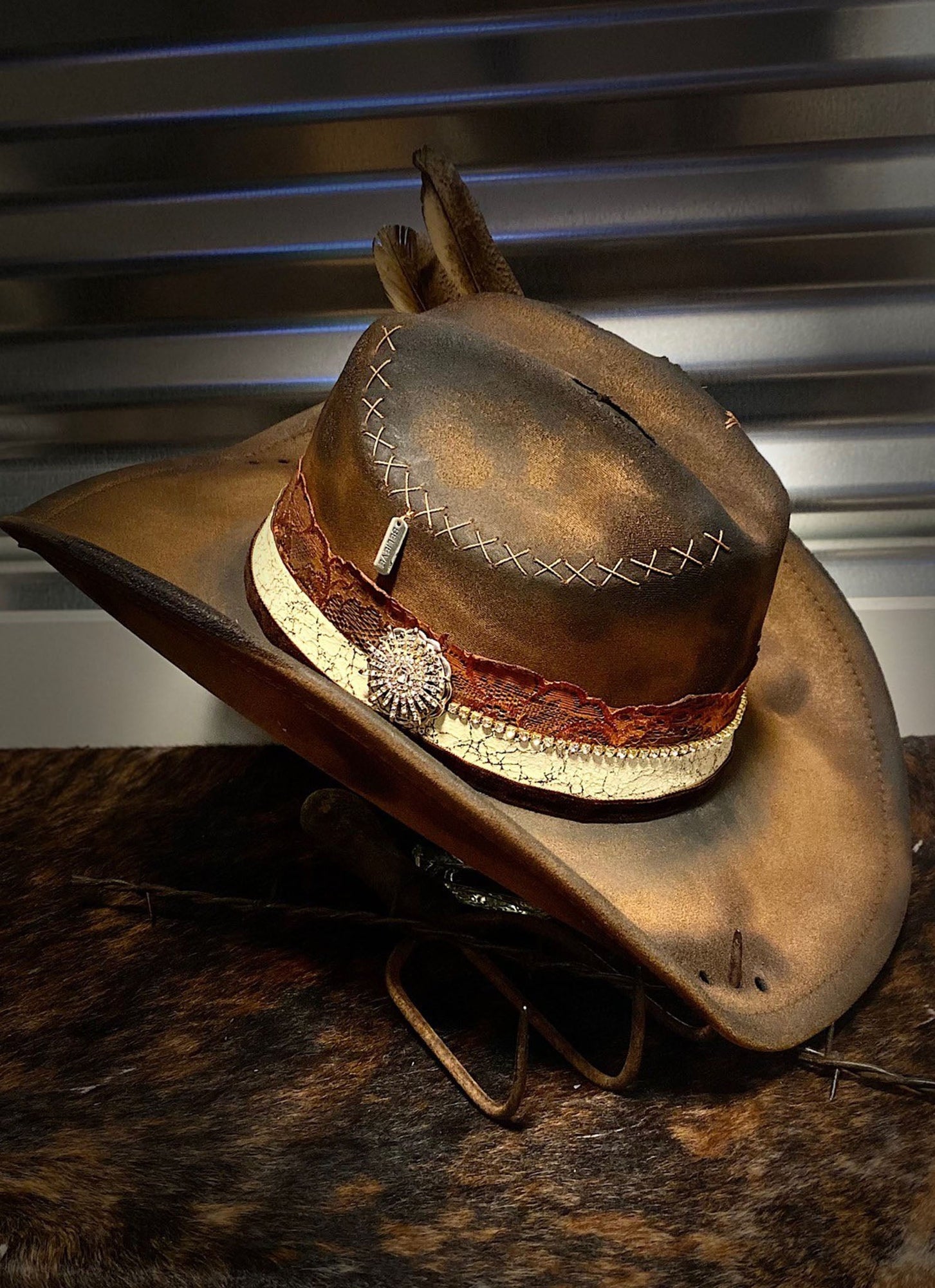 Hatband: Distressed Lace, Brown Trim, Crackle Leather, Rhinestone Components, Hand Stitching, Conchos, Swarovski Crystals accent the feathers.