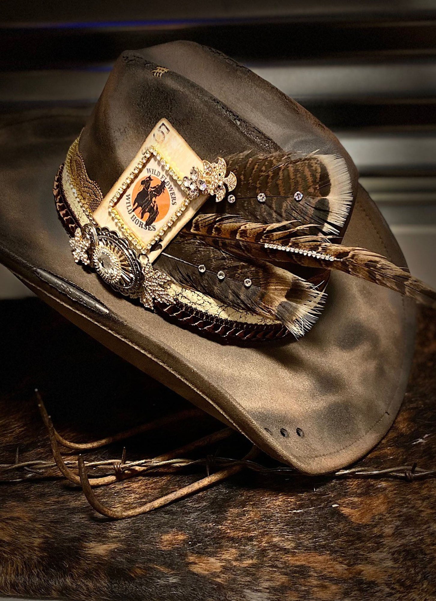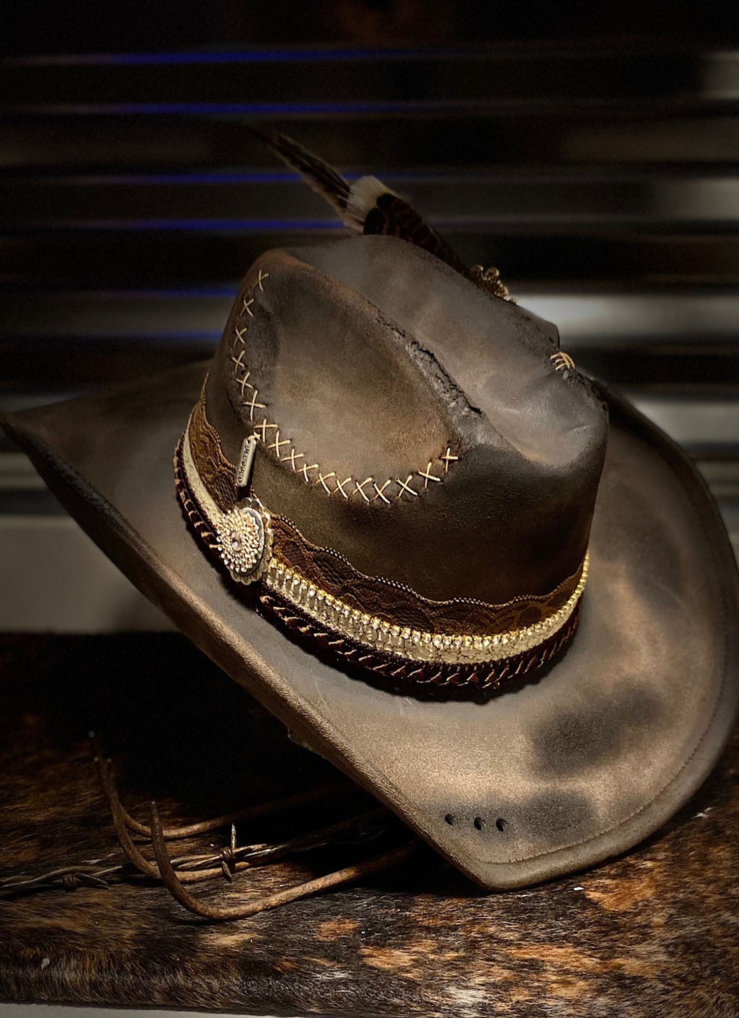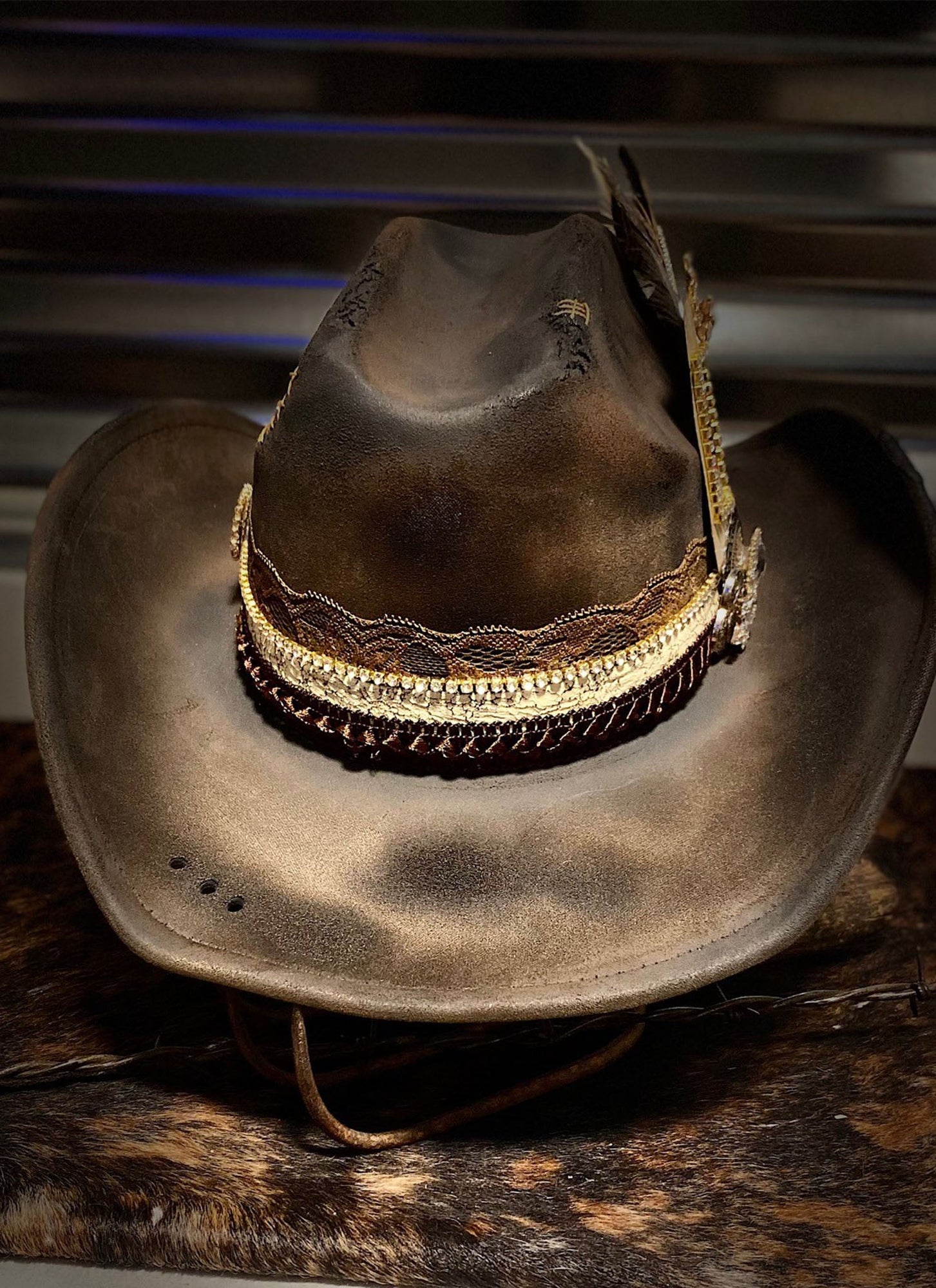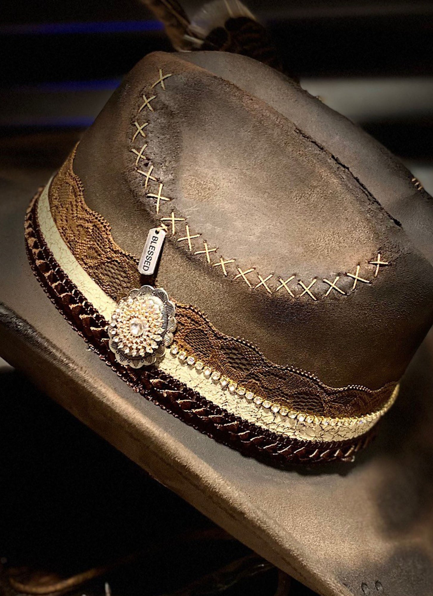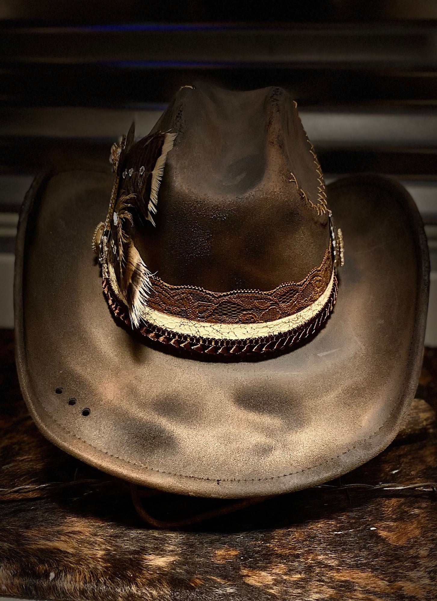 Hatband: Distressed Lace, Brown Trim, Crackle Leather, Rhinestone Components, Hand Stitching, Conchos, $warovski Crystals accent the feathers.