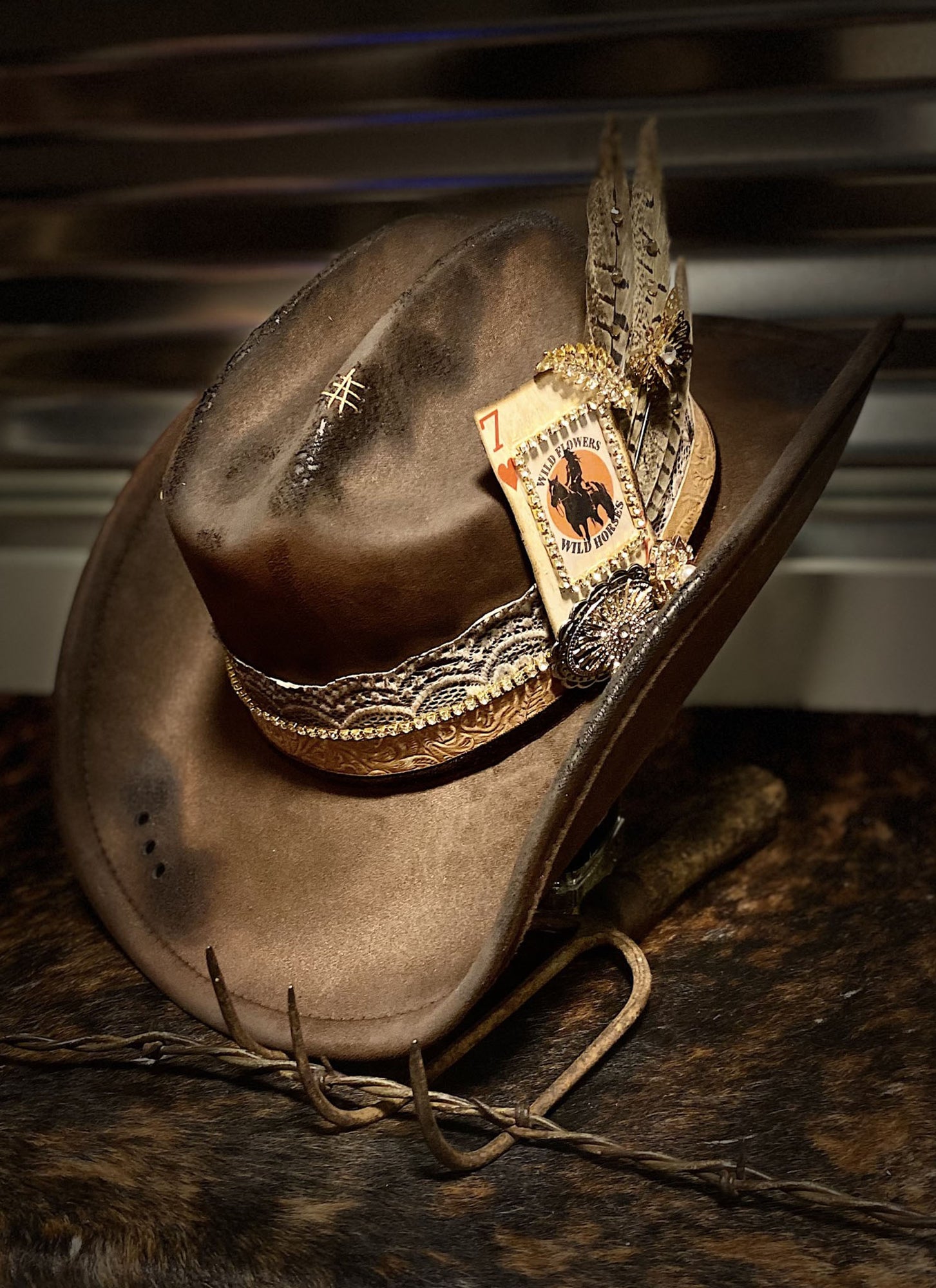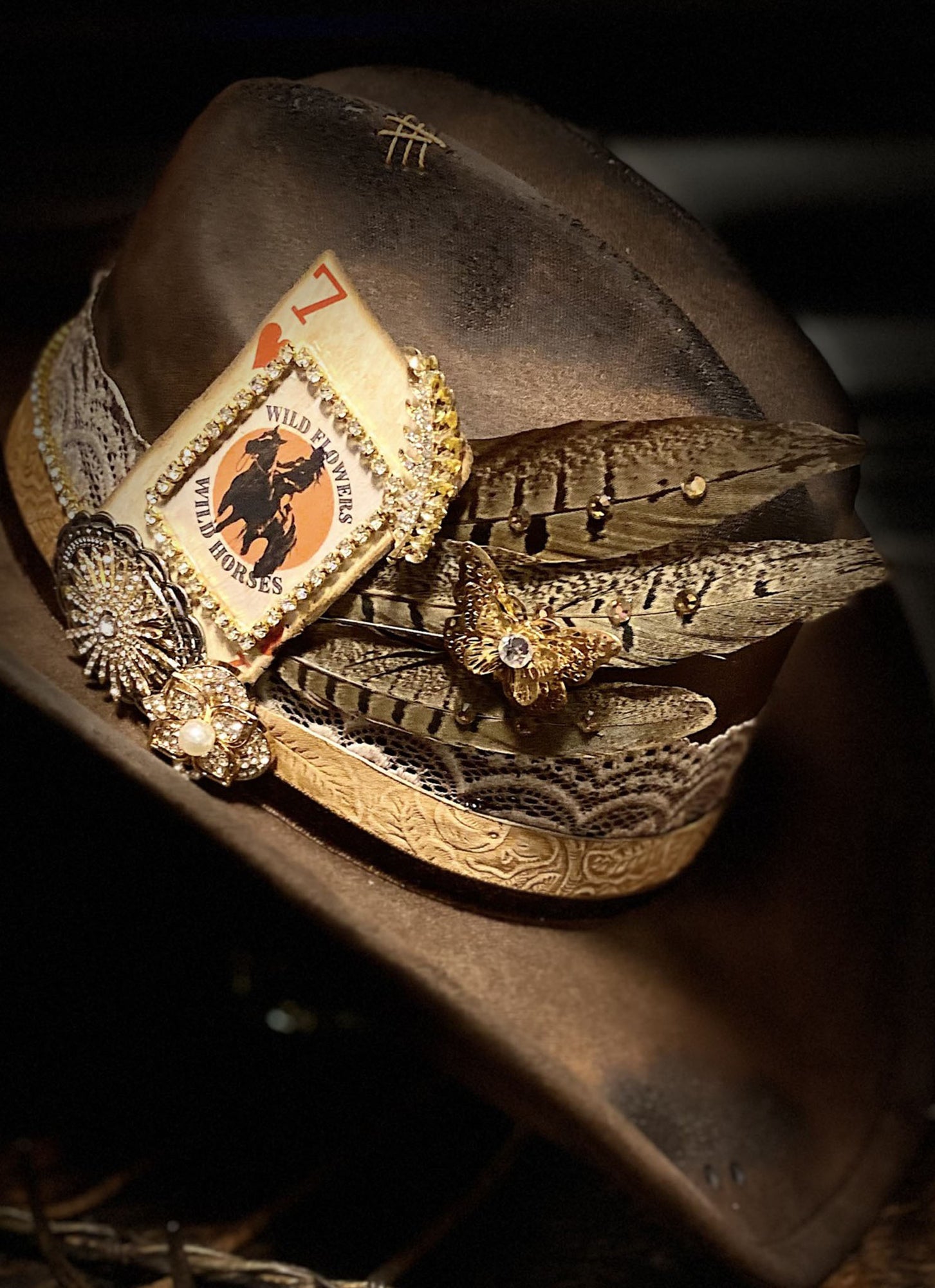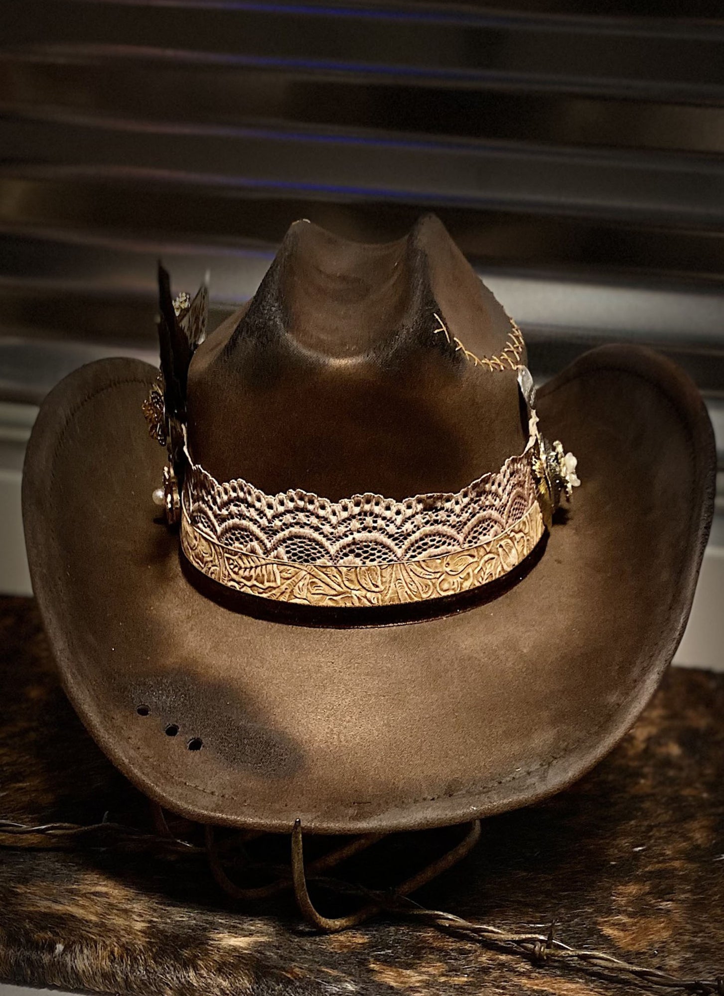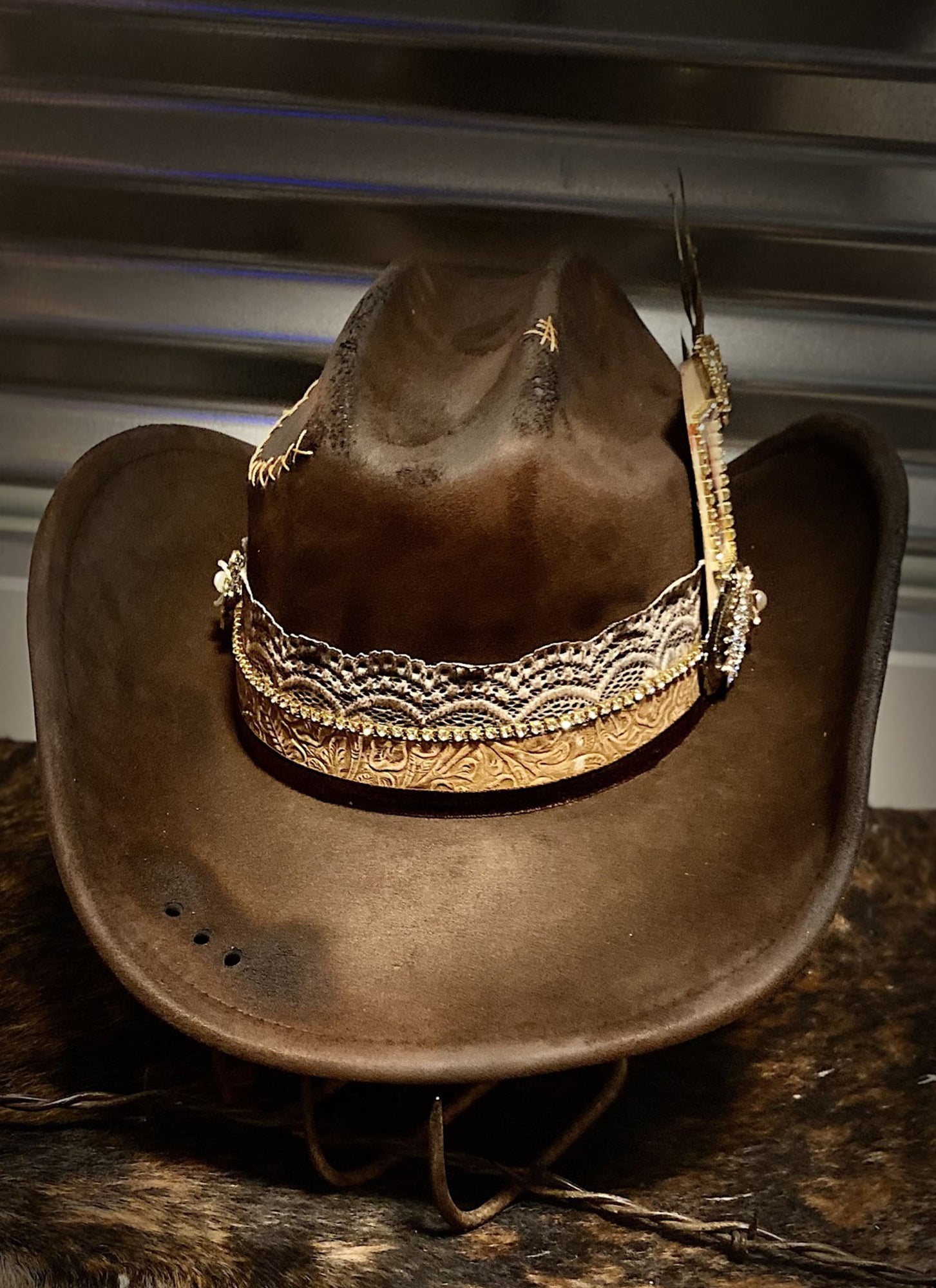 Hatband: Distressed Lace, Velveteen Trim, Embossed Leather, Rhinestone Components, Hand Stitching, Conchos, $warovski Crystals accent the feathers.