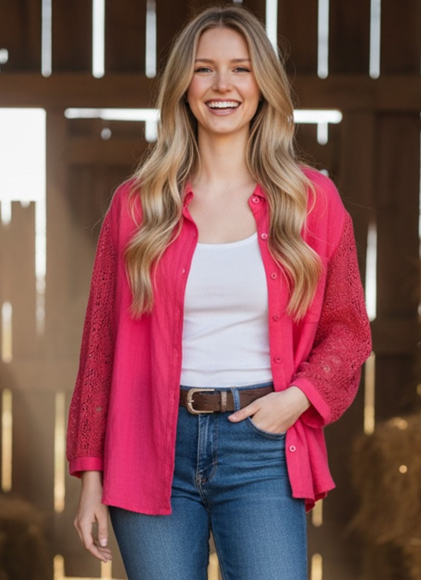 Charming button-down top featuring delicate crochet sleeves and a practical front pocket—the perfect blend of Western style and feminine detail.